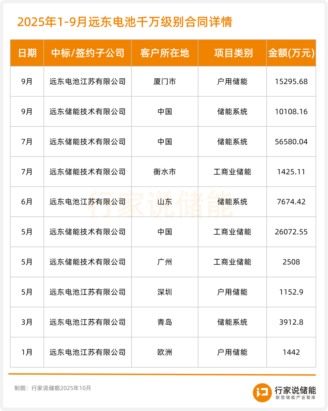 另据行家说储能统计,截止2025年9月底,远东电池披露的千万级别以上储能项目合同有10个,涉及储能系统、工商业储能和户用储能,金额总计超12.6亿元,其中主要承接储能业务的子公司为远东电池江苏有限公司和远东储能技术有限公司。